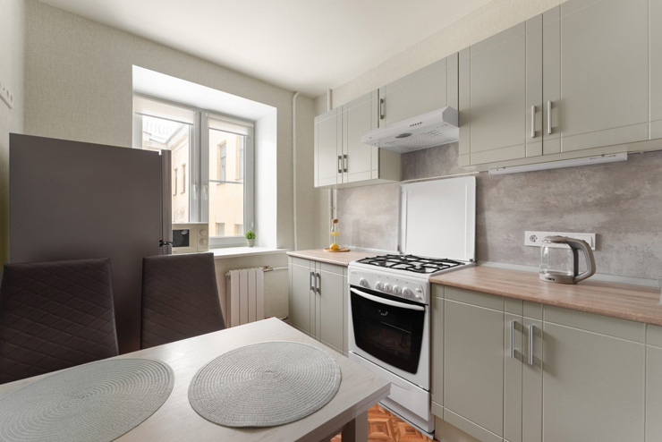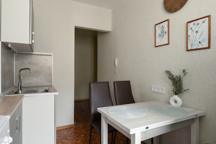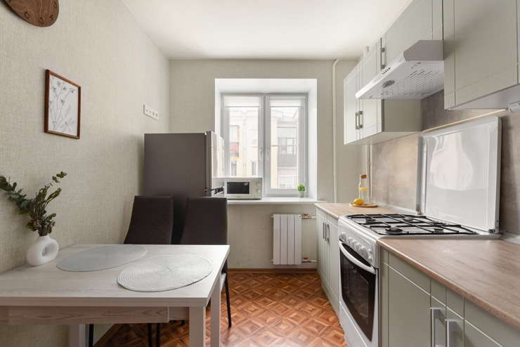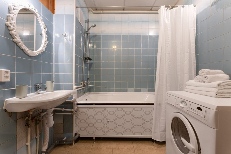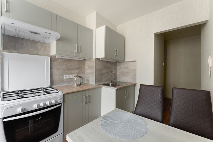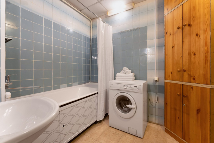 - Оборудование: гладильная доска, духовой шкаф, микроволновая печь, набор посуды, плита газовая, стиральная машина, телевизор, утюг, холодильник, электрочайник