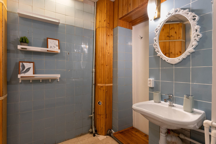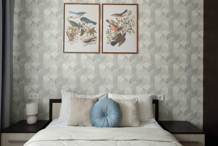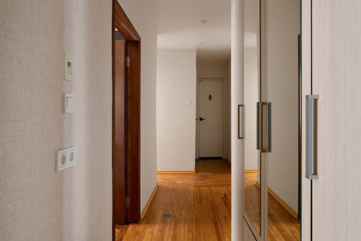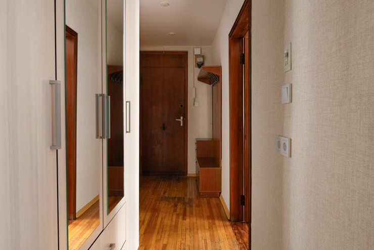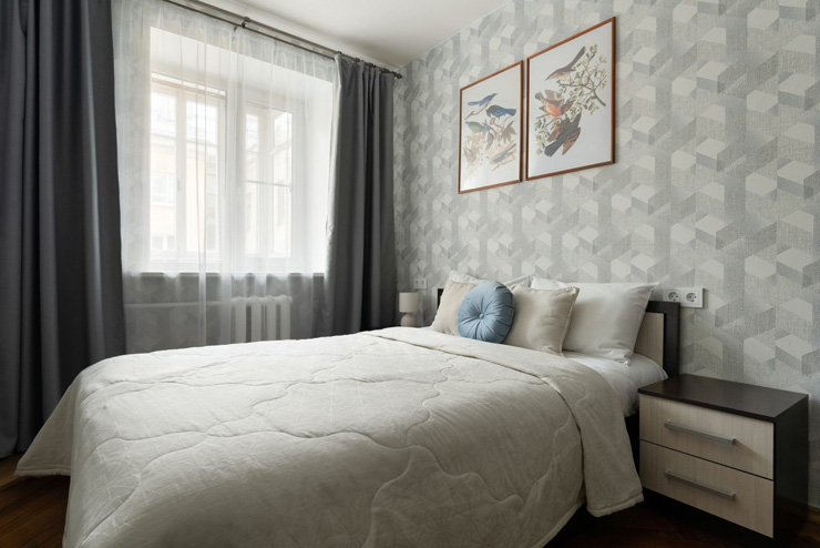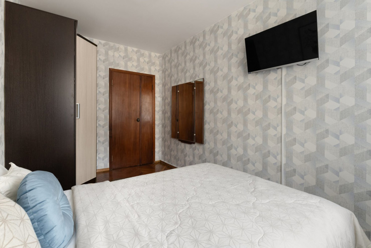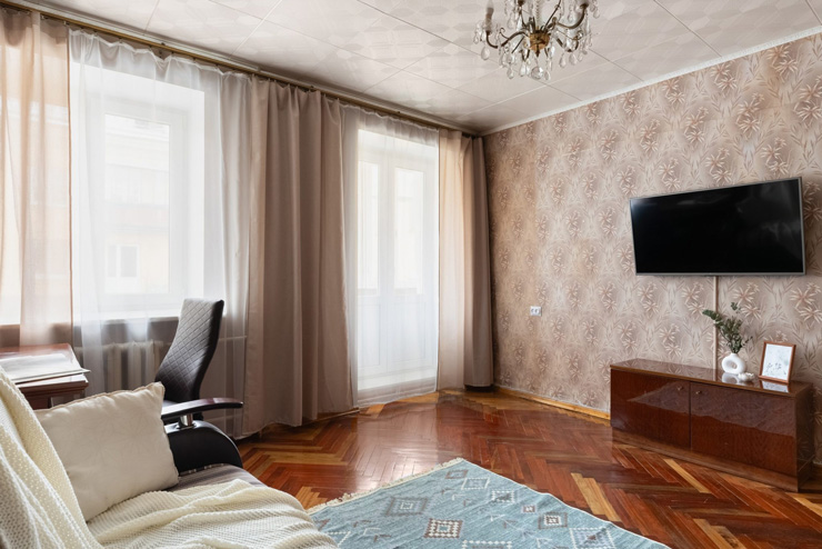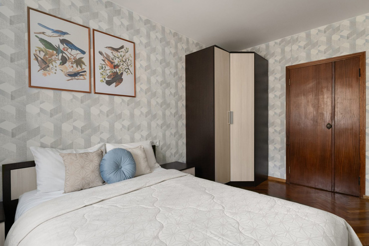 - Мебель: вешалка, диван раскладной, зеркало, кровать двуспальная, прикроватные тумбочки, стол, стулья, шкаф